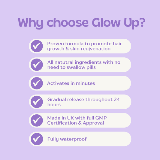 Customers love Glow Up for its ability to revive dull or uneven skin tone, enhance natural glow, and support hair growth while reducing visible signs of thinning or hair loss over time.