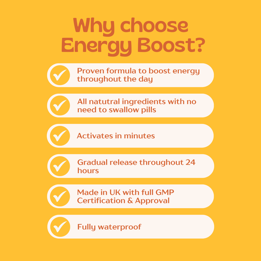 When fatigue hits, the Energy Boost Patch provides a clean, sustained lift with natural caffeine from green tea and guarana, plus B-vitamins for cellular energy and focus, no jitters, no crash.