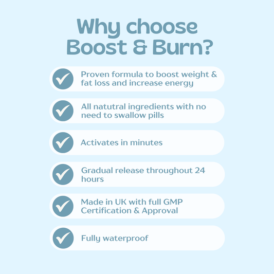 The Boost & Burn Patch features L-Carnitine, Green Tea Extract & Guarana, a botanical blend that supports metabolic function and helps the body convert nutrients into steady energy.