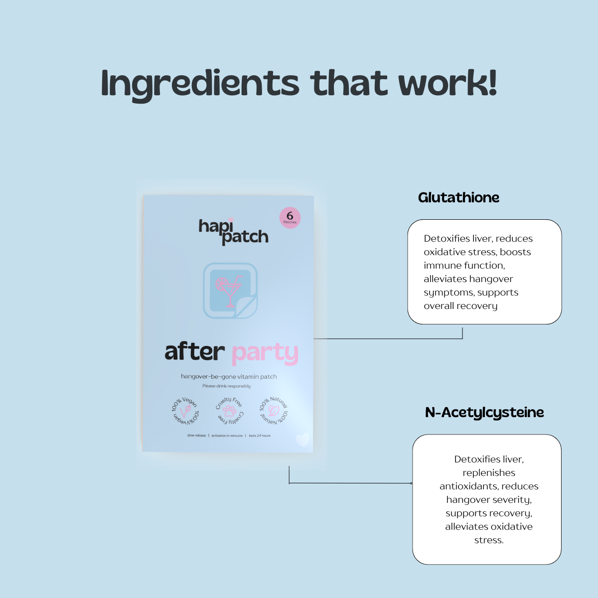 - After Party Patches (6 pack): Revitalise energy and alleviate hangover symptoms.