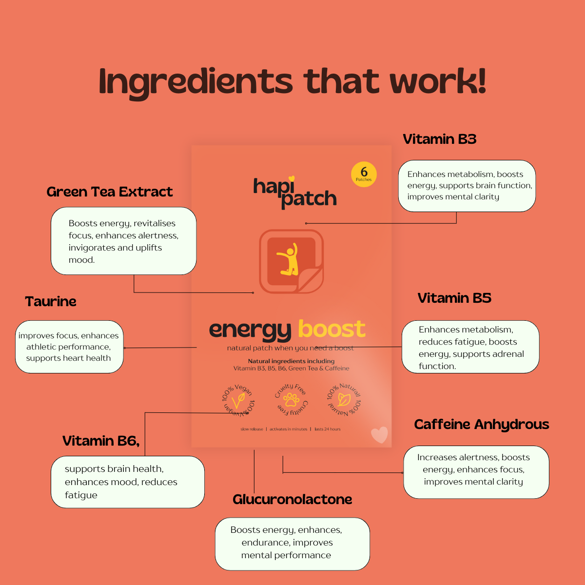 Are the ingredients in hapi patch vitamin patches natural? Yes, hapi patch vitamin patches are made with pure and organically produced ingredients, free from GMOs, gluten, and are vegan-friendly.